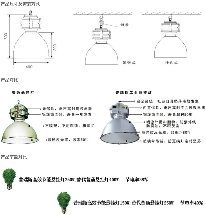應(yīng)用場所: 工業(yè)廠房、體育場、候車大廳、機(jī)場、博物館、商場、市、店鋪、各種專賣店。 電器配置: 》鎮(zhèn)流器:通過CE,CCC認(rèn)證的帶過熱保護(hù)鎮(zhèn)流器,防止光源壽命終結(jié)時產(chǎn)生的整流效應(yīng)而導(dǎo)致意外發(fā)生。 》觸發(fā)器:通過CE,CQC認(rèn)證的三線串聯(lián)式TC105℃觸發(fā)器。 》電容器:通過CE,CQC,UL認(rèn)證TCTC105℃的防爆自愈式鋁殼電容器。 可選用智能觸發(fā)器,具有自動檢測和延時關(guān)閉功能,能有效延長光源和電器的壽命,降低維護(hù)成本及避免維護(hù)時產(chǎn)生電氣安全隱患。 直接吊裝安裝、吊裝安裝、主電源線經(jīng)安裝系統(tǒng)走線。 產(chǎn)品參數(shù)信息: