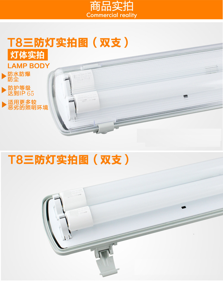 2:T8普通日光燈三防燈具,T8三防燈是一款應(yīng)用比較廣的燈具,是針對(duì)普通日光燈來設(shè)計(jì)的,有通用性,也是目前應(yīng)用較多的日光燈管。