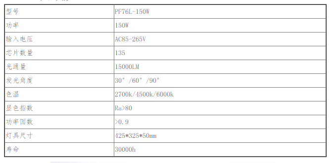 led泛光燈PF76L-150W產(chǎn)品參數(shù)